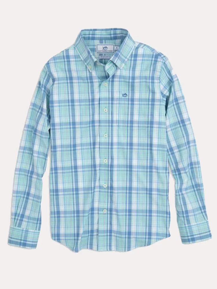 Pair this performance button-down shirt in coastal blue plaid with any boysย pantsย for a preppy look that s so comfortable he won t mind dressing up.